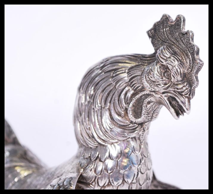 A vintage 20th century silver hallmarked large figurine of a fighting cockerel bearing London import marks and date letter m. Weighs 289 grams. Measures: 14cm high x 21cm wide.