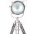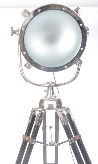 A stunning large contemporary chrome floor light comprising of an oversized theatre / search /cinema light / lamp style top with shutters and covers raised on an ebonised wooden and chromed tripod base. The item has been PAT tested. Measures 207cm tall.