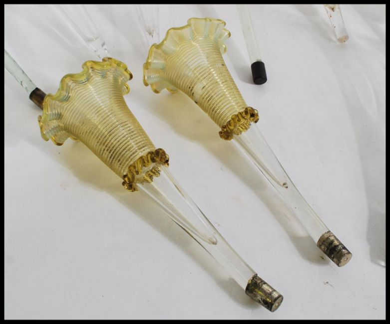 A collection of glass epergne trumpets in the form of flowers /  tulips. Each of tapering form with ribbed, pie crust, plain etc.. Some with iridescent and translucent colours, some with embellished glass detailing. 10 total. Tallest measures 28cm-high.
