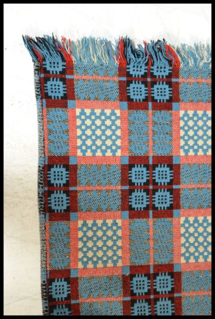 A vintage 20th Century traditional Welsh woollen carthen type fringed blanket with geometric decoration on a brown ground. Measures: 220cm high x 190cm wide.