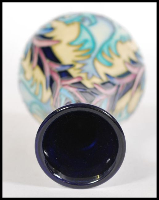 Moorcroft - Kerri Goodwin. A tubelined decorated baluster vase hand painted and decorated in the Moroccan Myths pattern featuring mythical birds on a cobalt blue ground. Impressed and painted marks to base. Measures 16cm-high. Complete with box and sleeve. First issue.