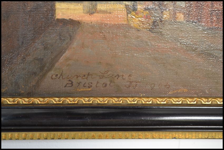 An Edwardian oil on canvas painting of Church Lane, Bristol dated 1903 and signed with monogram JJ. Winsor & Newton canvas with ebonised frame. Frame measures 30cms x 40cms