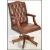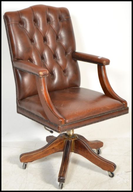An antique style tan brown leather and mahogany office swivel esk chair raised on a splayed mahogany reeded leg adjustable base with castors  having studded leather seat and back rest. Measures 103 cm x 59 cmx 53 cm.