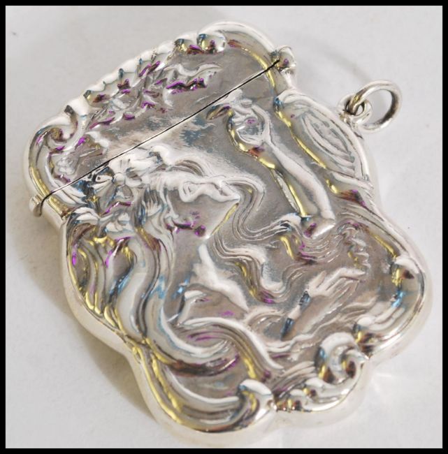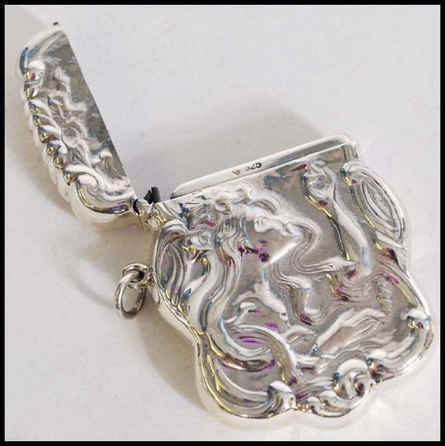 A 20th century stamped 925 silver Art Nouveau calling card case with embossed decoration of a woman. Weight 31.8g. Measures 16 cm long.