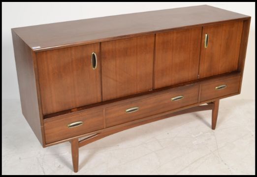 A 1960's / mid century Gomme / G-Plan teak wood cross over sideboard credenza being raised on tapering legs with a series of short drawers with cupboards above. Measures: 80cm high x 145cm wide x 49cm deep.