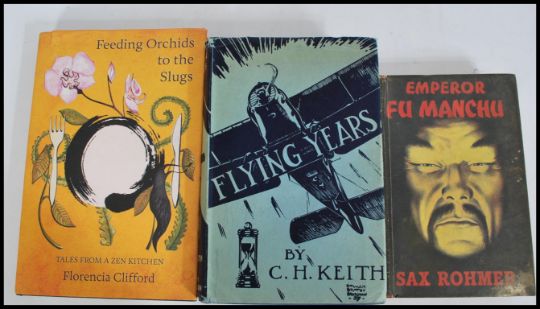 A selection of  books to include Emporer Fu Manchu by Sax Rohmer published by Herbert Jenkins London 1959, Flying Years by C. H. Keith, special edition for the Aviation book club published by John Hamilton Ltd. London and a signed edition of Feeding Orchids to the Slugs Tales from a Zen Kitchen by Florencia Clifford. Biggest measures 24cm-high 16cm-wide.