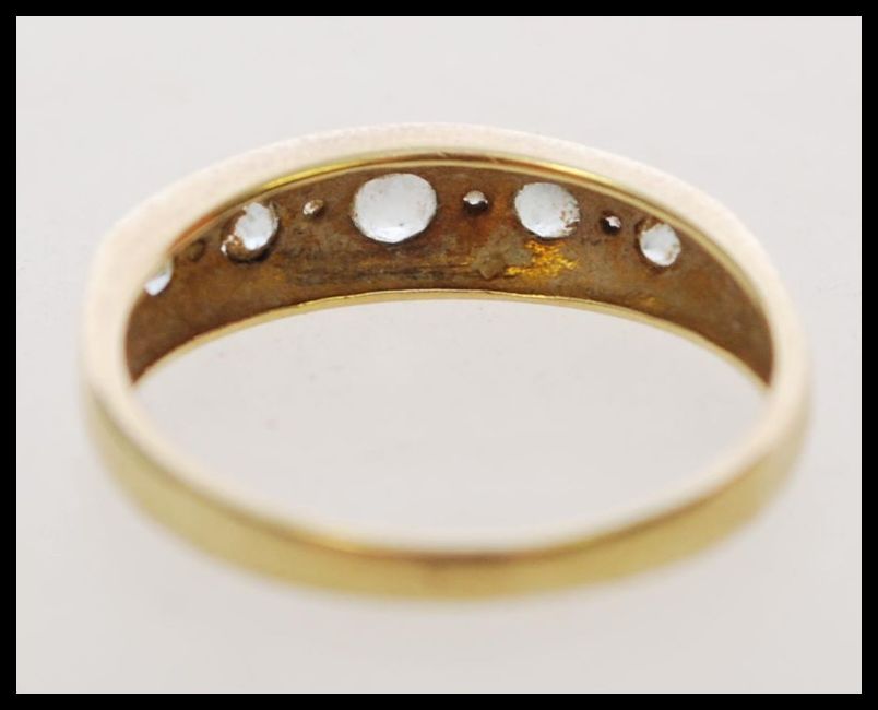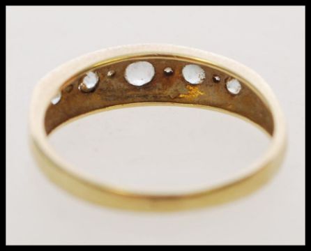 A hallmarked 9ct gold ring having channel set pale blue stones with accent diamonds. Hallmarked Sheffield. Weight 2.1g. Size N.