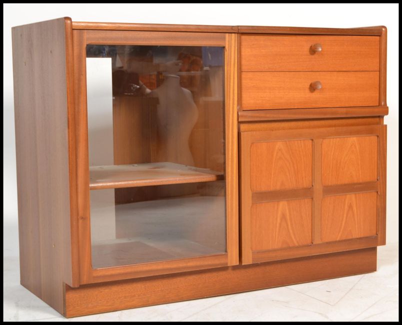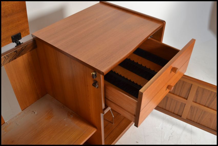 A retro 20th Century teak wood Nathan entertainment music cabinet / sideboard, glazed door below lift up top for loading of vinyl records, flanked by two drawers above cupboard. Measures: 75cm high x 100cm wide x 45cm deep.
