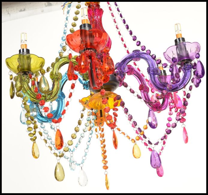A retro 20th Century multi coloured hanging six sconce chandelier, of traditional design. Measures: 75cm high x 55cm wide.
