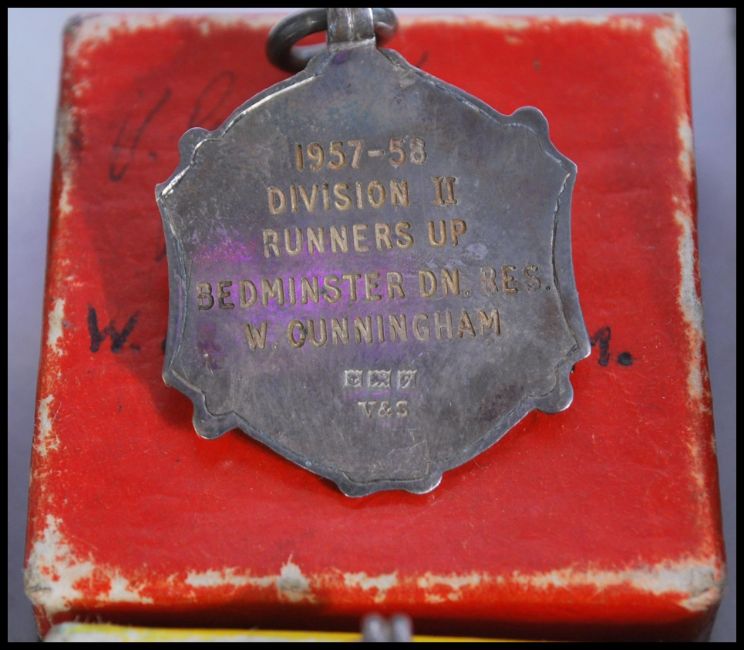 A collection of mid 20th century medals of W. Gunningham to include hallmarked Birmingham silver Bristol football medals for the 1957-58 division winners for Bedminster Down and the 1957 division II runners up, a selection of Bristol Federation of Boy's Clubs medals including for the junior relay 1942, medal for the 2nd division football championship 1940-41, and throwing cricket ball 1942 and a F. Phillips of Aldershot medal for boxing. Biggest box measures 17cm-high 5cm-wide.