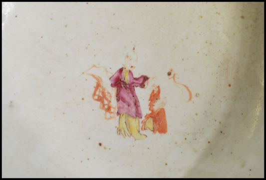 An 18th / 19th century Chinese famille rose fruit bowl painted with decorative scenes of family and mortals on cloud in garden scenes with flowers and trees. The inside with geometric borders and central mortal / god figure over smaller figure with raised arm to base of the bowl. Measures 11cm-high 26cm-diameter.