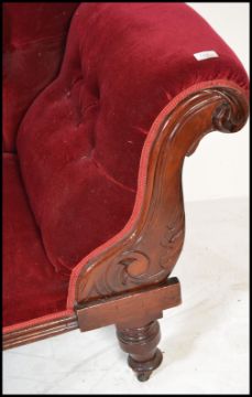 A Victorian mahogany chaise longue / day bed being raised on turned legs with show wood frame, arched back rests and upholstered in a red velour. Measures 81 cm x 170 cm x 60 cm.