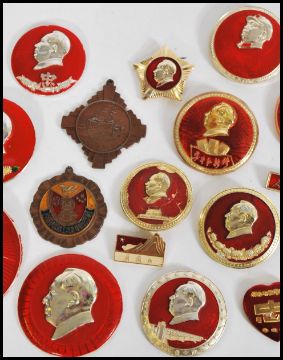 A collection of 20th century Chinese medals with many depicting cameo's of chairman Mao, with pins to the verso, and two metal examples one being enamelled. Largest measures 6 cm diameter.