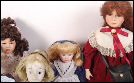 A collection of 12x assorted porcelain collectors dolls with stands . Each doll in different clothing and varying sizes. Average measure; 44cm tall.