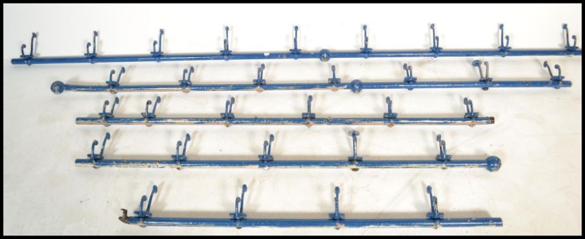 A collection of 19th Century Victorian industrial steel and brass coat hooks on rail. The rail being made of tubular steel with ball finials and  braced hooks with number plaques in sequential order. Removed from an Victorian school in Wales. Measures 280 cm long.