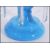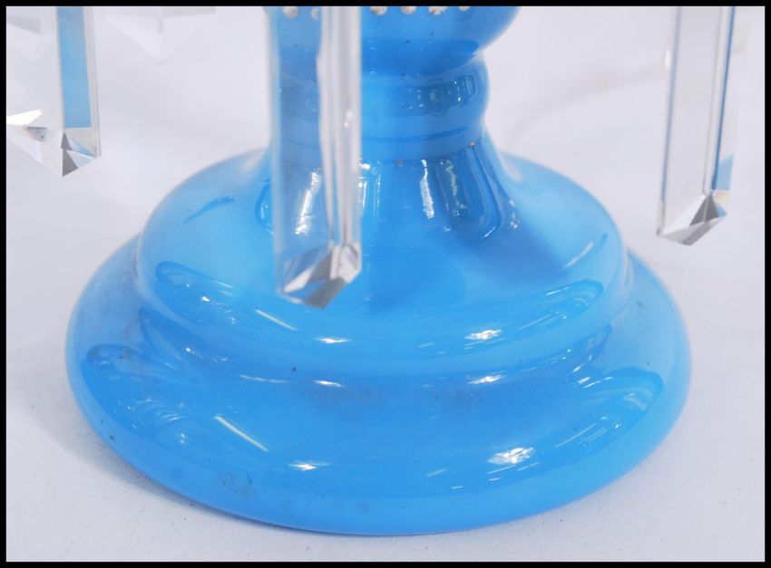 A 19th century Victorian garniture of blue glass lustres, to include two matching with with fanned rims, having six prismatic cut glass crystal drops and hand painted gilt overlay to the tops and stems, raised on round bases with baluster shaped stems. Also with a blue glass lustre having a crenelated rim, hand painted vine and fruit gilt work and faceted cut glass drops. Tallest measures 27cm-high 11cm-diameter.