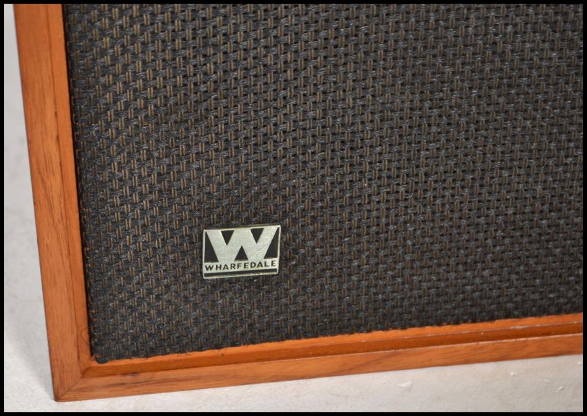A vintage 20th century teak cased record player music cabinet having a Garrard AP76 deck with a stereo system underneath along with a pair of tall Wharfedale Dovedale 3 speakers. Measures: 61cm high x 36cm wide x 31cm deep.