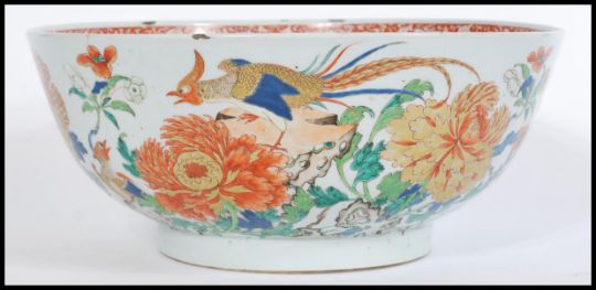 A large 18th / 19th century Chinese famille rose punch / fruit bowl painted with chrysanthemum and peonies flowers with large Asiatic pheasant bird. The interior with foliate spray and geometric pattern borders. Measures 16cm-high 39cm-diameter.