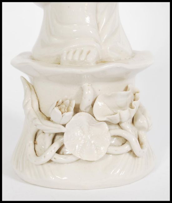 A china blanc de chine figurine of a Chinese immortal holding a lotus flower raised on a circular pedestal base with floral decorations.