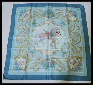 A vintage Hermes ' Cheval Turc ' silk scarf, originally designed by Christiane Vauzelles in 1969, in blues and greens, with applied retailers label for Harrods. Measures88cm x 88cm