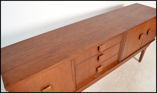 A vintage retro 20th century teak wood sideboard raised on tapered legs with shaped square handles having twin cupboard to one side and bank of drawers and single cupboard to other. Measures 76 cm x 181 cm x 42 cm.