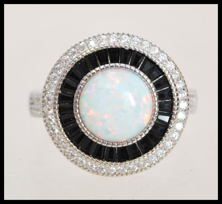 A stamped 925 silver metal halo ring in the Art Deco style set with white and blue stones around a central opal. Weight 7.6g. Size Q.5.