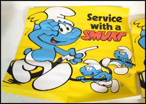 Two large 20th century vintage advertising posters for national petrol from 1978 featuring Smurf's operating a petrol pump reading "Service with a Smurf" on a yellow background, along with window transfer stickers featuring Astro Smurf, Brainy Smurf, Smurfette, Papa Smurf and Rocker Smurf. Measures 117 cm x 120 cm.