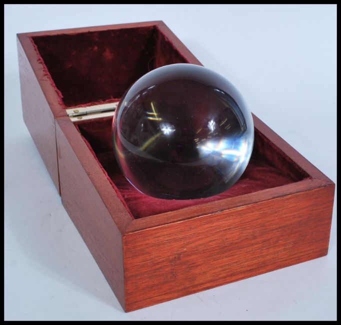 A 20th century gypsy fortune tellers crystal ball in wooden case together with a wooden glass plinth having battery inset base, another mirror glass plinth, table cloth, unusual adornments to include pyramids etc