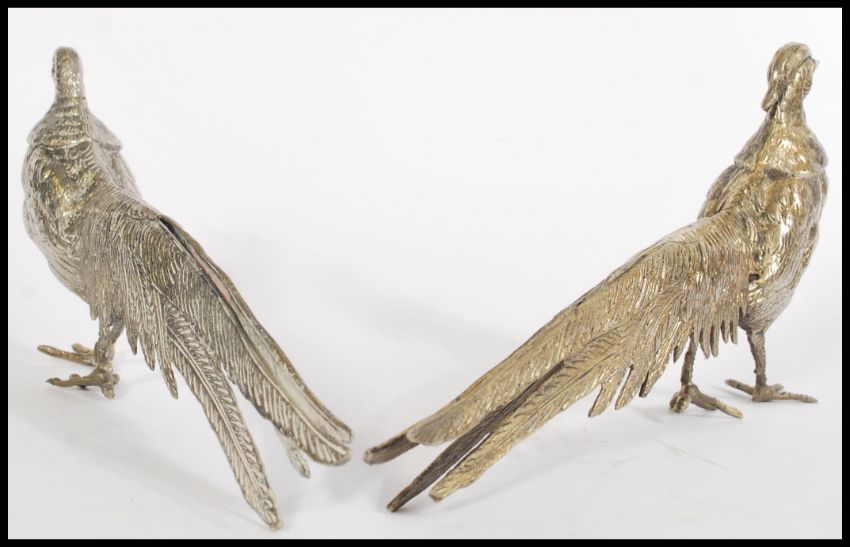 Two pairs of vintage 20th century silver plated brace pairs of pheasants one being a pair of typical size the other a miniature pair. Biggest measures 14cm-high.