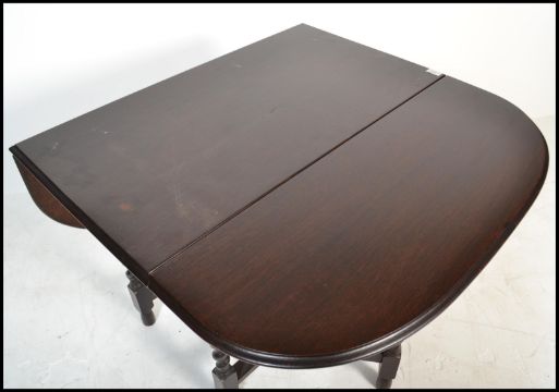 A 1930's solid oak barley twist drop leaf extending pad foot dining table with gate leg action supporting a large table top. Measures 72 cm x 92 cm x 53 cm.