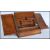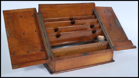 A Victorian Walnut desk tidy, the front hinging at the centre to reveal and arrangement of pigeon holes with space for ink bottles and pens, on an overhanging moulded base. Measures 26cm-high 29cm-wide.