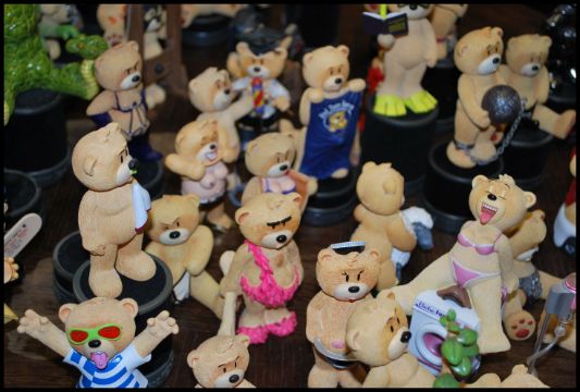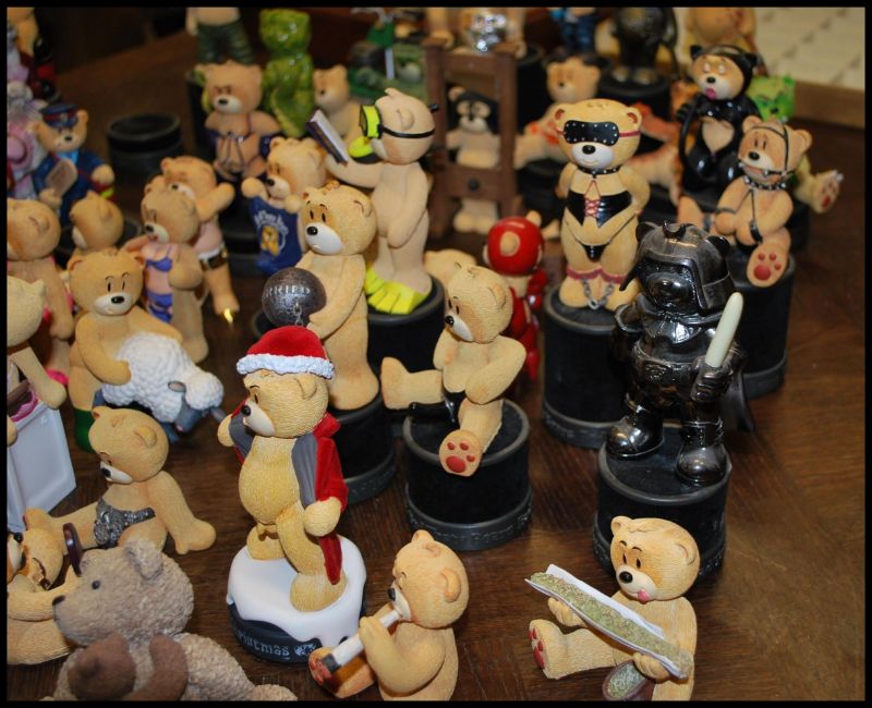 A large collection of novelty Bad Taste Bear figurines to include Mexican bear, Santa, diving bear, stripping bear, smoking bear and many more.