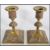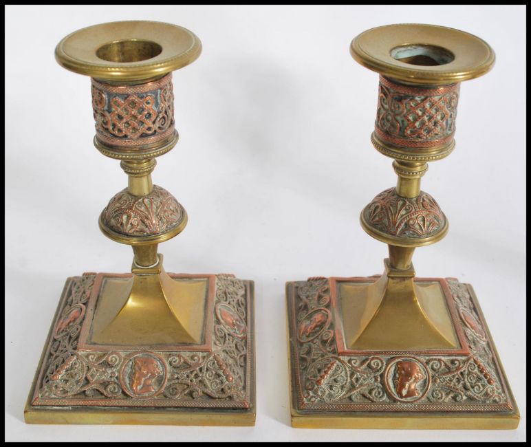 Two pairs of Victorian brass candle stick holders to include a pair of brass and copper candlesticks on square bases with ornate copper scrolled and cameo detailing to the base, column and sconce along with a pair of brass square based candlesticks with a twisted column and a thissel sconce. Measures 31 cm high.