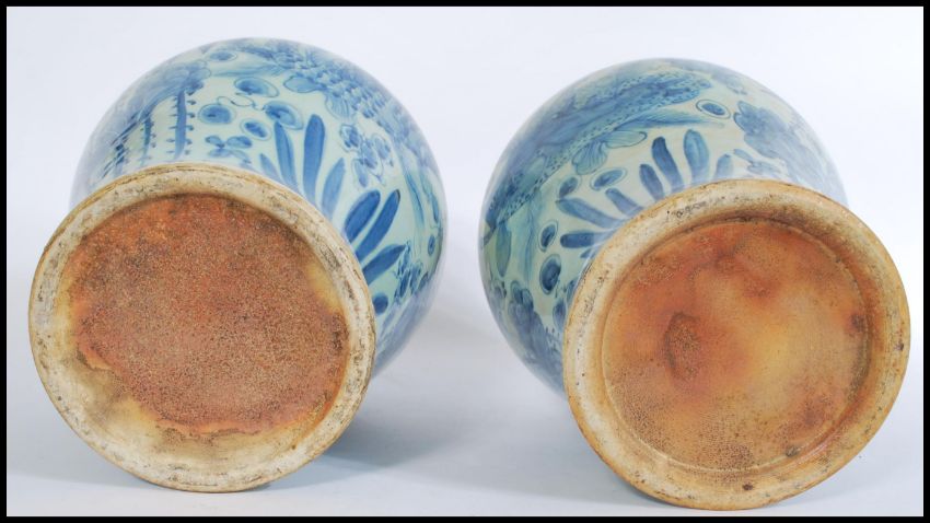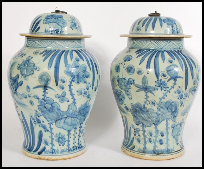 A pair Chinese blue and white large tall lidded vases having hand painted decorated with underwater scenes of carp and foliage. The bodies of bulbous form, bronze hoop handles to the flared lids. Measures 42cm-high 24cm-diameter.