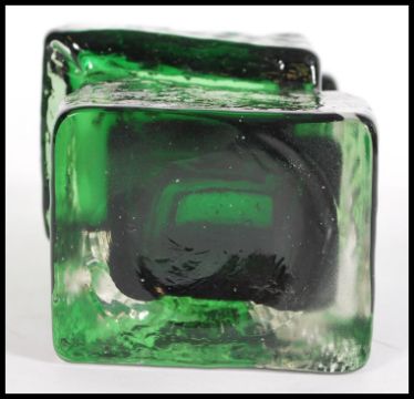 A vintage 20th century Whitefriars style green drunken bricklayer vase in the manner of Geoffrey Baxter. Measures 21 cm high.