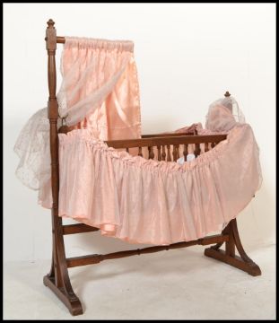 A mid 20th century childs oak crib having swing action. The crib with gallery sides complete with lined interior fabrics etc