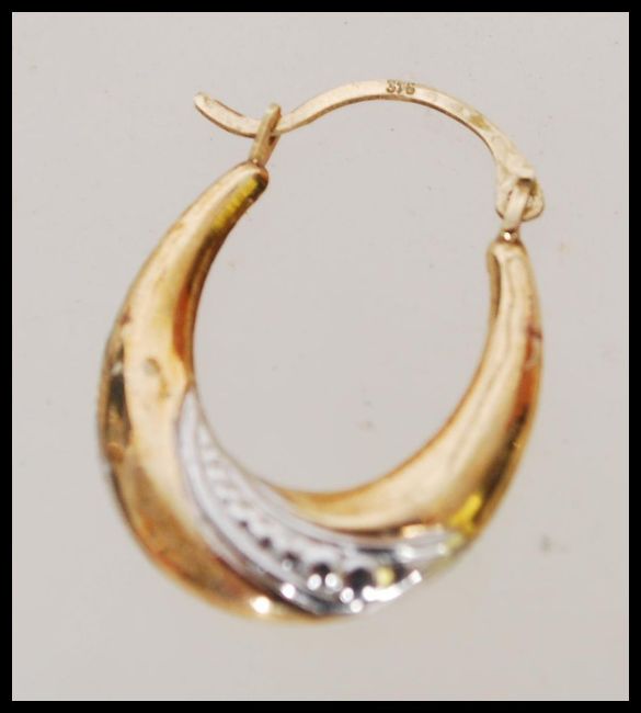 A pair of 9ct gold hooped earrings with silver detailing weighing 1g. Measures 2 cm high.