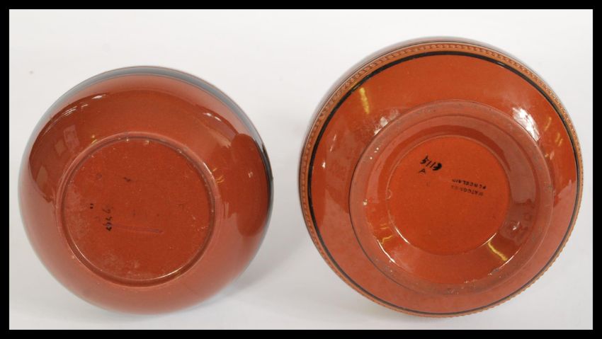 Attributed to Christopher Dresser  (1834-1904) - Watcombe Pottery, Torquay pottery, two late 19th Century vases of compressed form, enamelled with panels of stylised foliage printed factory marks to base. Measures 28cm-high 16cm-diameter.