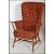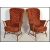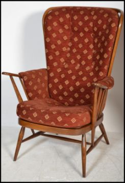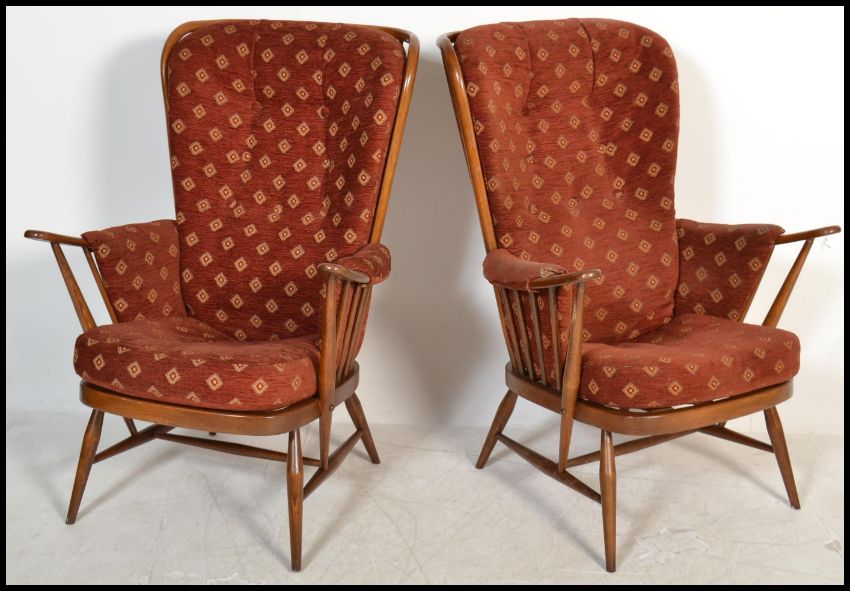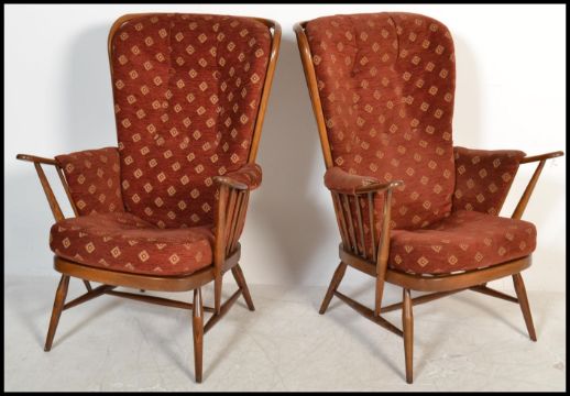 A pair of vintage retro 20th century Ercol beech and elm wing back spindle back armchairs raised on tapered supports with red fabric cushions. Measures 106 cm x 76 cm x 56 cm.