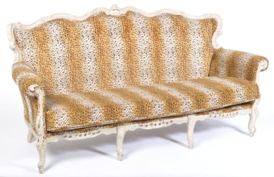 Louis XVI style French white pointed canape sofa. The sofa having wooden carved scroll decoration being painted white the cushioned seat and backrest being upholstered in a faux cheetah skin fabric all being raised on tapering column supports. Measures 95 cm high and 191 cm wide.