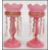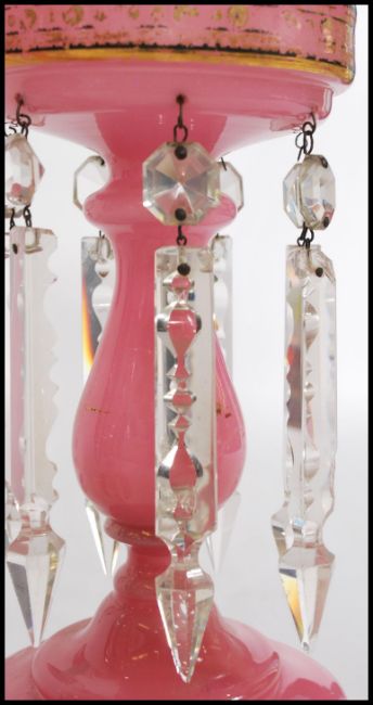 A pair of 19th century Victorian pink glass lustres with with crenelated rims, having seven prismatic faceted cut glass crystal drops, with hand painted gilt overlay to the tops and rims, raised on circular stepped bases with baluster shaped stems. Measures 30cm-high 14cm-diameter.