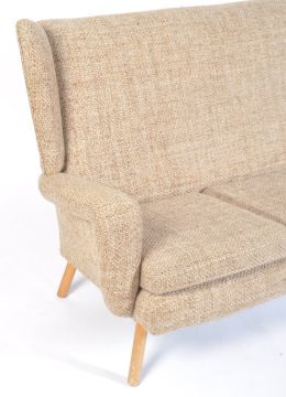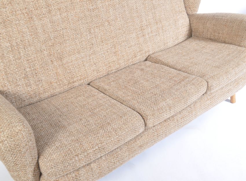 An original retro vintage 1950's 3 seat sofa / settee . The sofa comprising of a tall winged backrest with enveloped armrests and three seat cushions all raised on angled cylindrical legs and upholstered in a beige woollen weaved material. Bearing similarities to Howard Keith. Measures 97cm x 172cm x 67cm. Matching armchairs in consecutive lot.