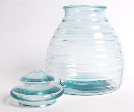 A 20th century large lidded pressed glass apothecary / bon bon / sweet jar. The clear glass jar having a stepped form and impress hole to side resembling a bee hive , the lid having a domed knob handle. Measures 34 cm high and 28 cm wide.