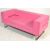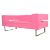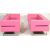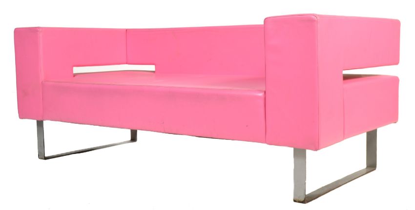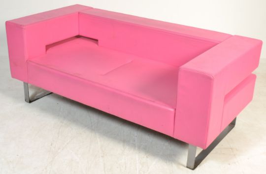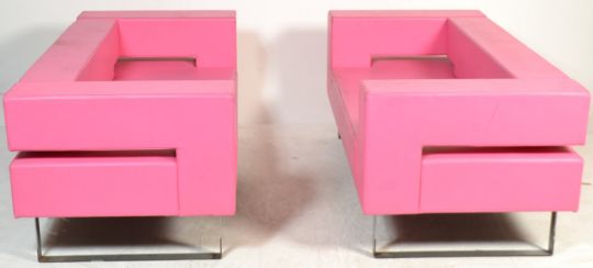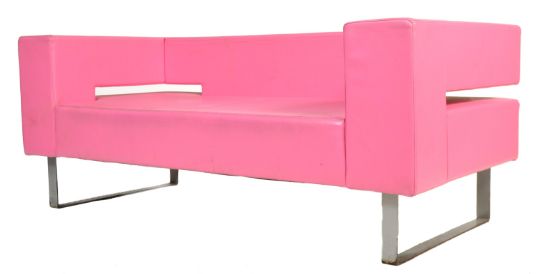 A pair of striking contemporary retro style lounge two seater sofa 's / settee 's having straight lines and cube form. Each sofa upholstered in a vibrant hot pink leatherette material raised on bent flat steel supports. The design baring some similarities Boss Design. Measures 68cm x 170cm x 81cm.