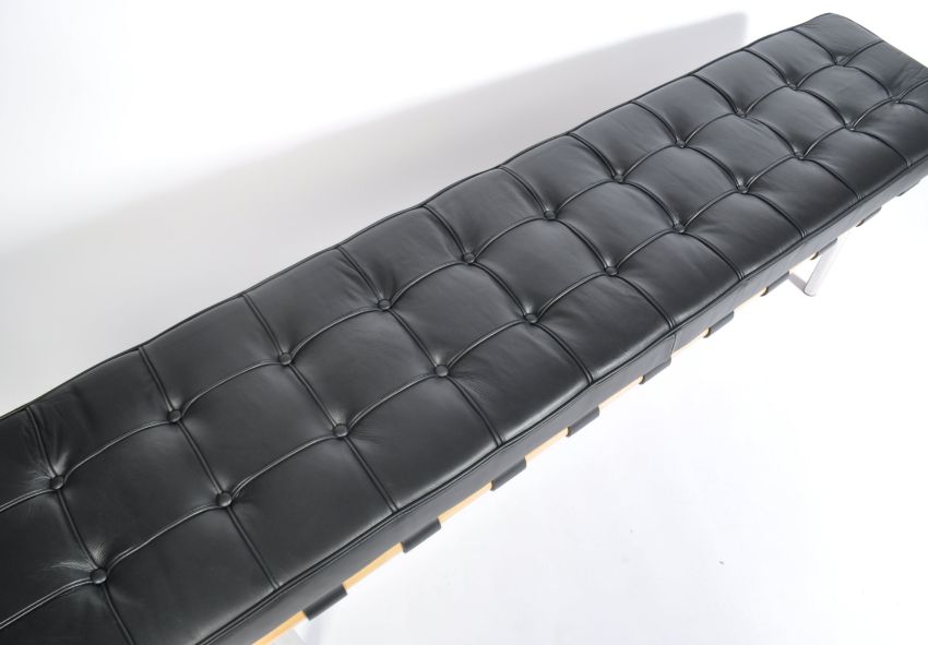 After Mies Van Der Rohe - Barcelona bench - A contemporary maple wood and leather bench. The bench frame made of solid maple with webbing and a black semi aniline leather button backed cushion with straps to attach, the frame raised on chromed cylindrical legs. Measures 48 cm high, 193 cm wide and 43 cm deep.