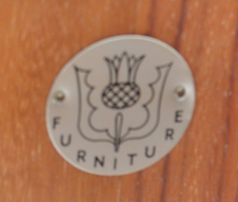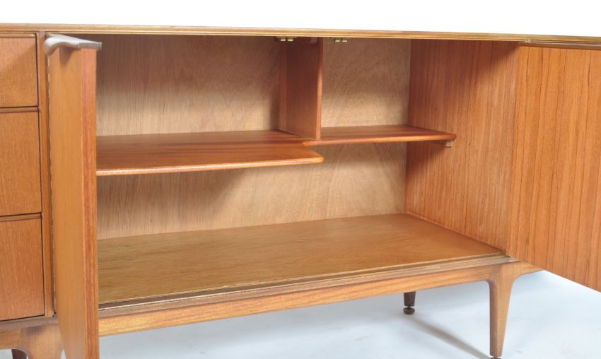 A.H. McIntosh Of Kirkcaldy - Dunvegan range - A 1960's retro vintage teak wood sideboard having the central twin door cupboard with shelved interior flanked by a drop down cocktail cabinet and at the other end a bank of three drawers, each drawer and door having lipped handles and all raised on tapering legs. The sideboard being complete with tags and a letter of correspondence from McIntosh after receiving a thank you letter and explaining care instructions. Matching table in the following lot. Measures 67 cm high, 202 cm wide and 46 cm deep.