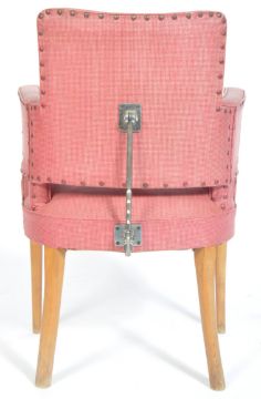 A 1950's retro vintage barbers salon chair / armchair upholstered in a Gingham painted red vinyl having a drop down backrest with angular shaped and studded armrests all being raised on beech round tapering legs. Measures 86cm x 65cm x 58cm.
