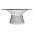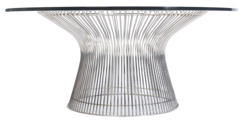 After Warren Platner - A contemporary wire and glass coffee / centre table. The table having a designed vortex like wire framed base in polished steel with a heavy round glass top. Measures; 39cm x 92cm diameter.