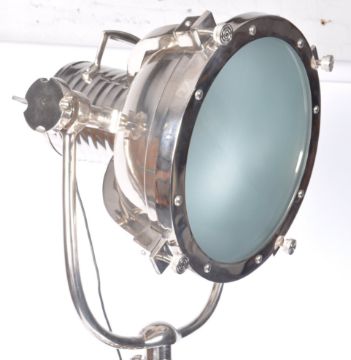 A stunning large contemporary chrome floor light comprising of an oversized theatre / search /cinema light / lamp style top with shutters and covers raised on an ebonised wooden and chromed tripod base. The item has been PAT tested. Measures 207cm tall.