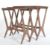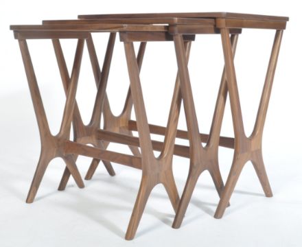 A contemporary 'x' framed solid walnut nest of tables. The set of three tables consisting of flat rectangular tops with rounded edged 'x' frame legs with grooves for for the smaller table to store underneath. Measures 54cm x 56cm x 36cm.